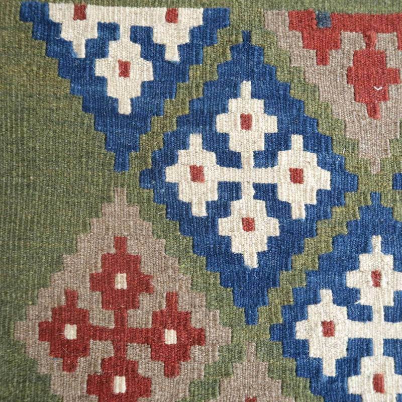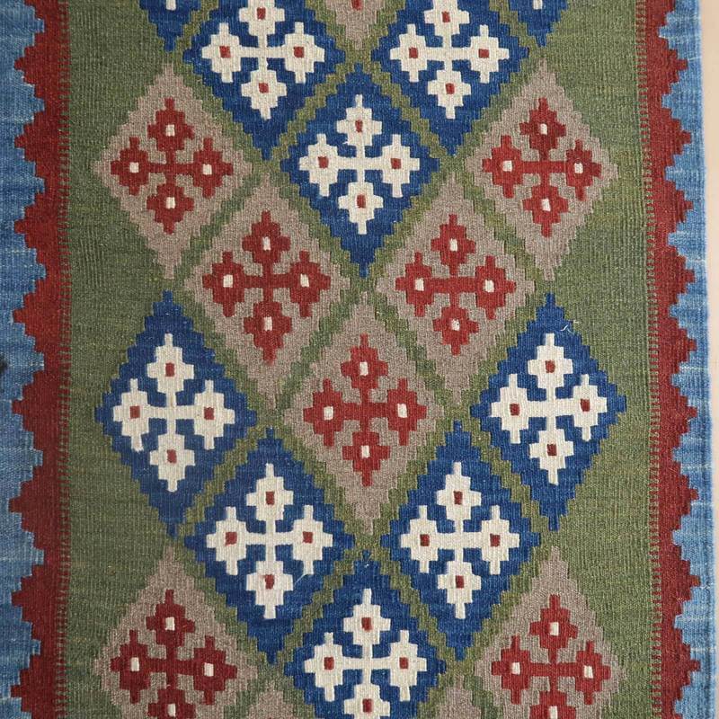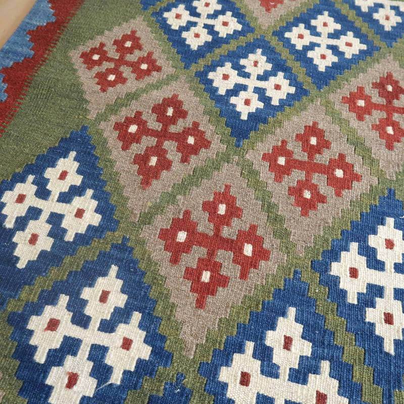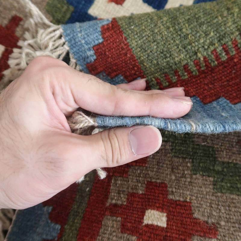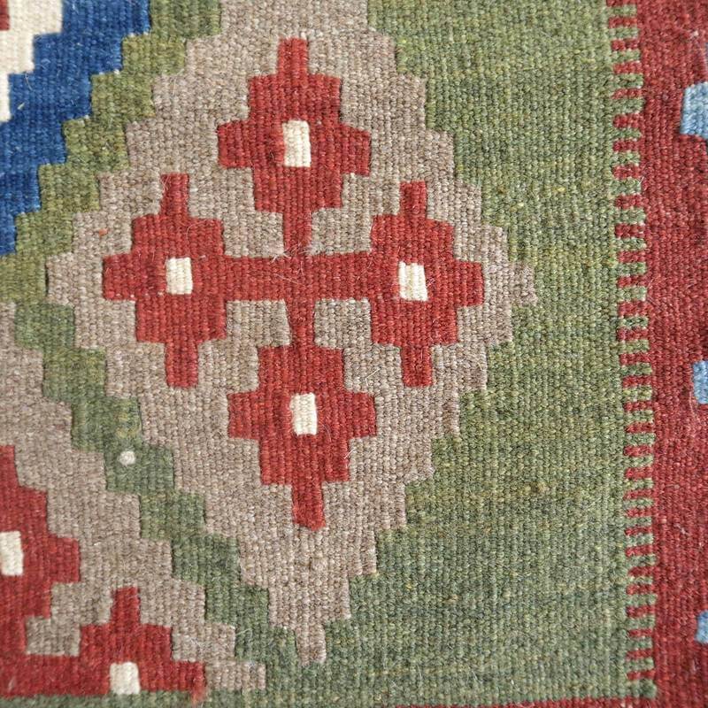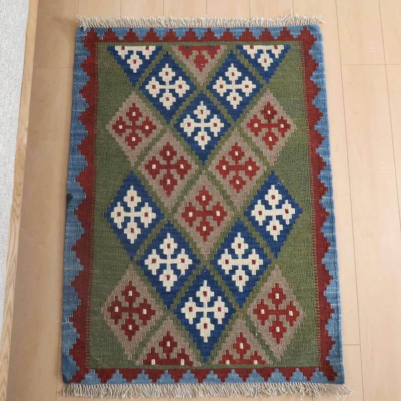 イラン南部シラーズ地方のキリムです。いくつかの色を使用した幾何学柄やギザギザ文様はリズムのある明るい雰囲気。使用している色はどれも、くすみのある落ち着いた色なので、目立たずインテリアに馴染みます。カシュガイの女性が昔ながらに織り上げたキリムなので、よく締まった丈夫な織り目で、早く仕上げる為、ゆるく粗く織られる商用生産のキリムには無い、誠実さが伝わってくる一枚です。また、平織り(ひらおり)という裏表の無い織り方で両面使えます。カシュガイ・キリムは遊牧のテント生活用の為、丈夫に織られ、洗濯も簡単、価格以上の価値を感じて頂けるキリムです。