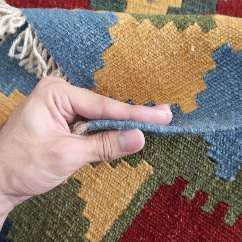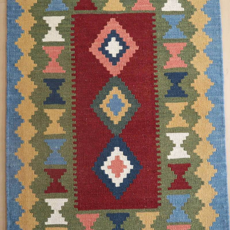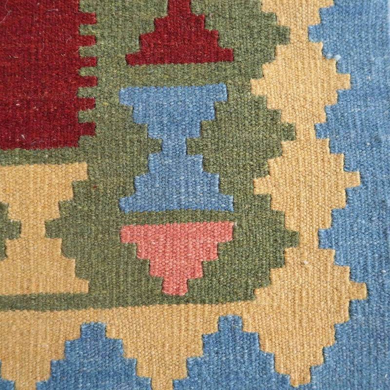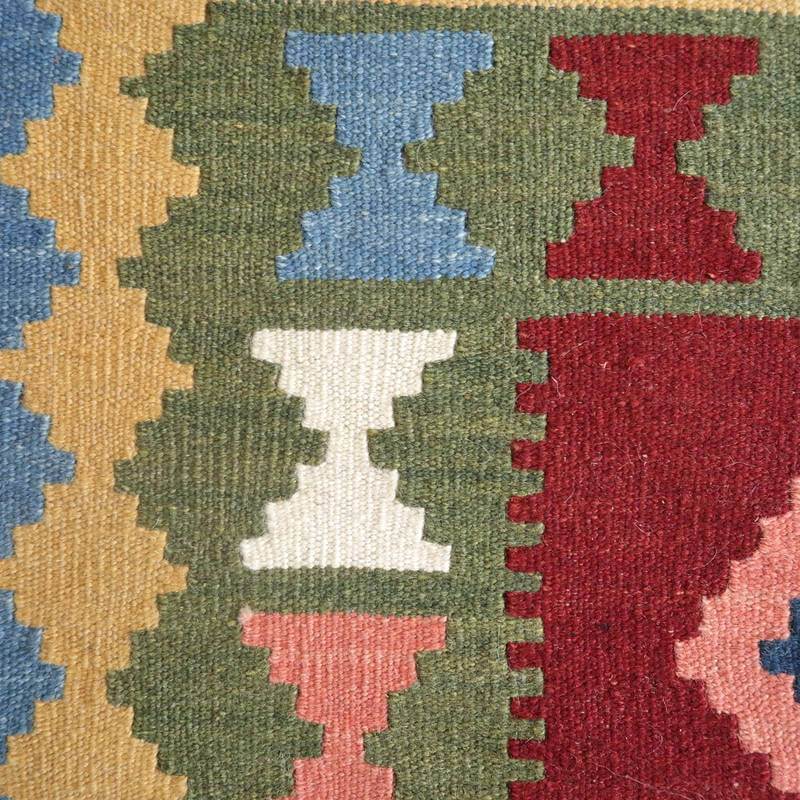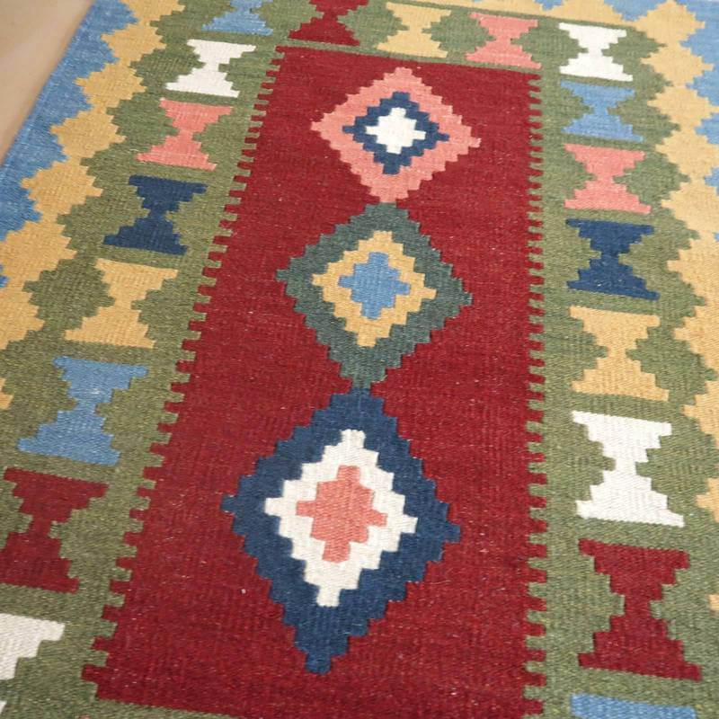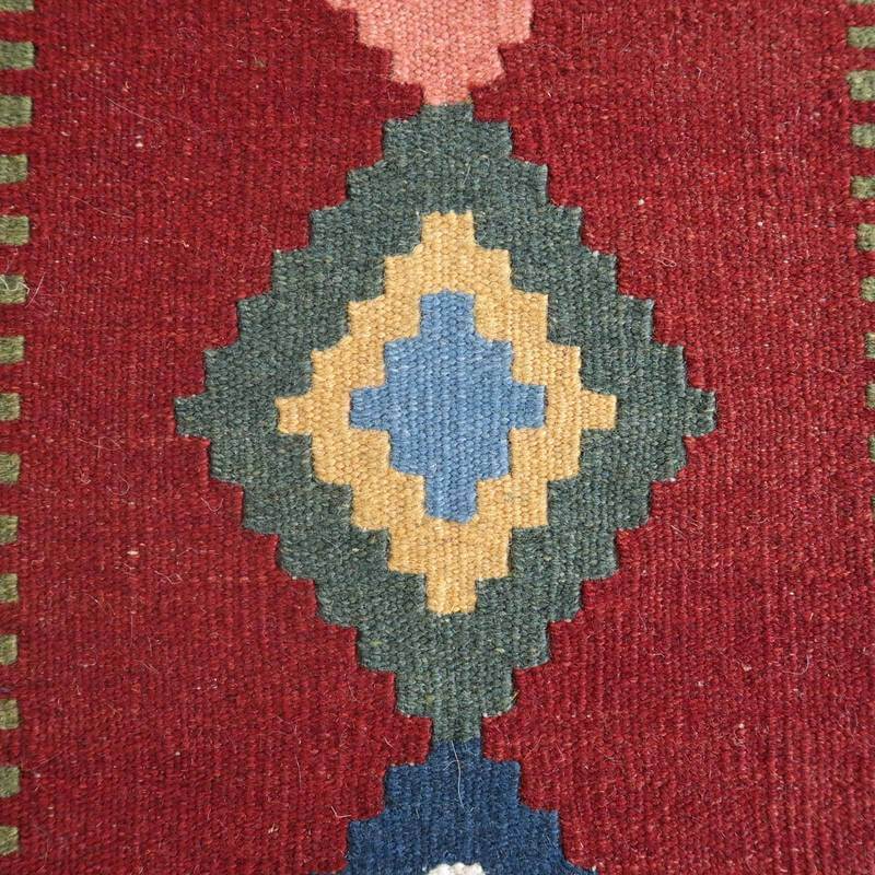 イラン南部シラーズ地方のキリムです。いくつかの色を使用した幾何学柄やギザギザ文様はリズムのある明るい雰囲気。使用している色はどれも、くすみのある落ち着いた色なので、目立たずインテリアに馴染みます。カシュガイの女性が昔ながらに織り上げたキリムなので、よく締まった丈夫な織り目で、早く仕上げる為、ゆるく粗く織られる商用生産のキリムには無い、誠実さが伝わってくる一枚です。また、平織り(ひらおり)という裏表の無い織り方で両面使えます。カシュガイ・キリムは遊牧のテント生活用の為、丈夫に織られ、洗濯も簡単、価格以上の価値を感じて頂けるキリムです。