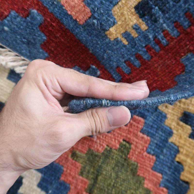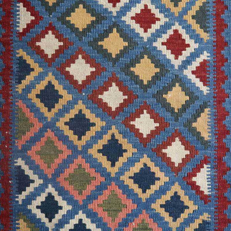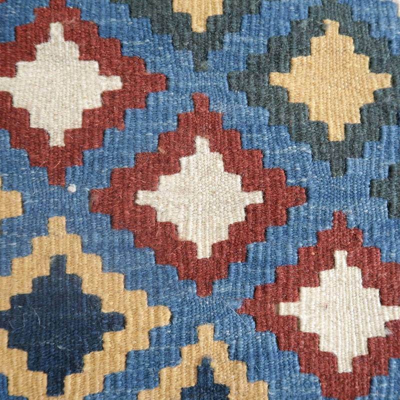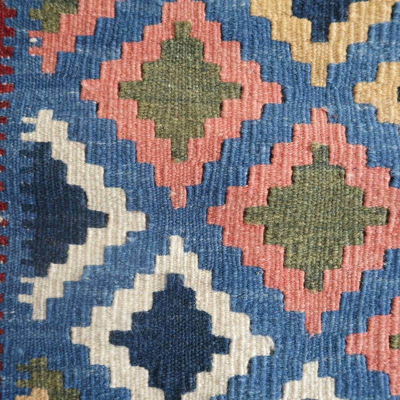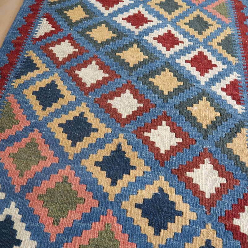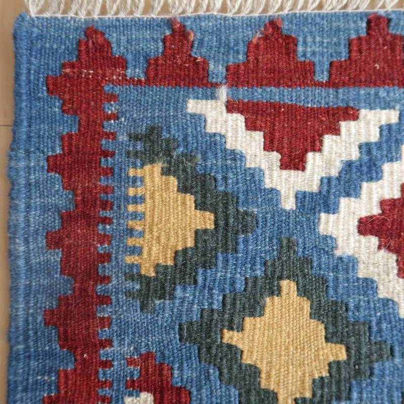 イラン南部シラーズ地方のキリムです。いくつかの色を使用した幾何学柄やギザギザ文様はリズムのある明るい雰囲気。使用している色はどれも、くすみのある落ち着いた色なので、目立たずインテリアに馴染みます。カシュガイの女性が昔ながらに織り上げたキリムなので、よく締まった丈夫な織り目で、早く仕上げる為、ゆるく粗く織られる商用生産のキリムには無い、誠実さが伝わってくる一枚です。また、平織り(ひらおり)という裏表の無い織り方で両面使えます。カシュガイ・キリムは遊牧のテント生活用の為、丈夫に織られ、洗濯も簡単、価格以上の価値を感じて頂けるキリムです。