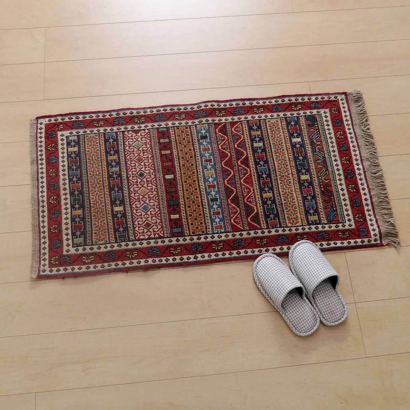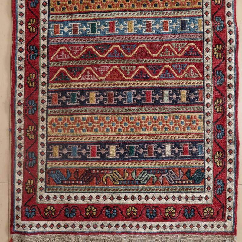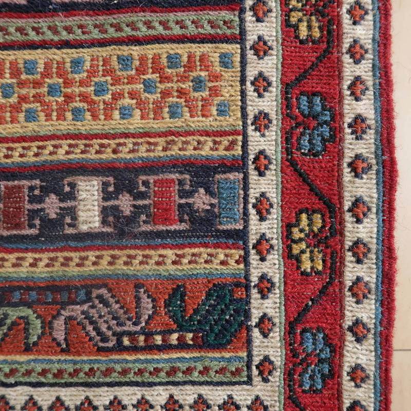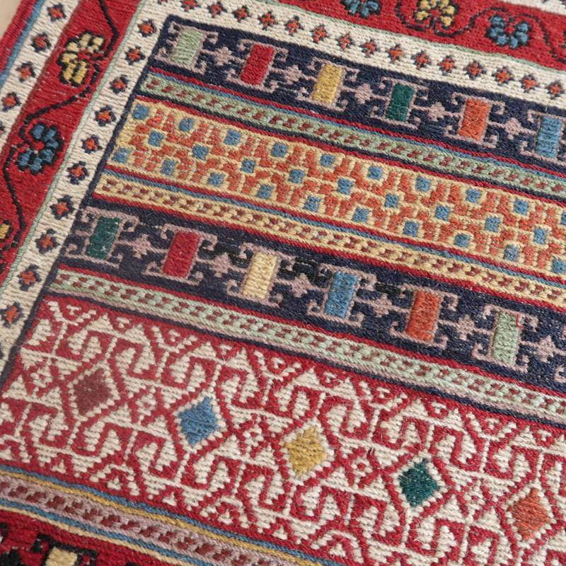 刺繍のように細かな文様が全面に施された美しいスマック織りのキリム。赤を基調に様々な色で文様が入った多色使いですが柄が細かいので落ち着きもあります。一目一目の模様をじっくり眺めて味わえるキリムでたいへん上質感があります。スマック織りは裏面に模様の糸を渡してあるので片面使いのキリムになります。