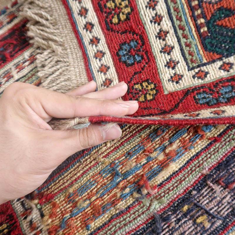 スマック織りとは、イランのキリムの織り方の技法です。生地は刺繍のような仕上がりですが、これは後から刺したものではなく、土台の縦糸と横糸の上にもう一本横糸を絡めるように巻き込んで織っていく高度なテクニックで、生地を二重に織るため通常の平織りのキリムより倍の手間ひまが掛かる分高価になりますが、非常に堅固で丈夫、また普通より細かなデザインを描けるという長所がありますので、価格以上の価値を感じて頂けるキリムです。