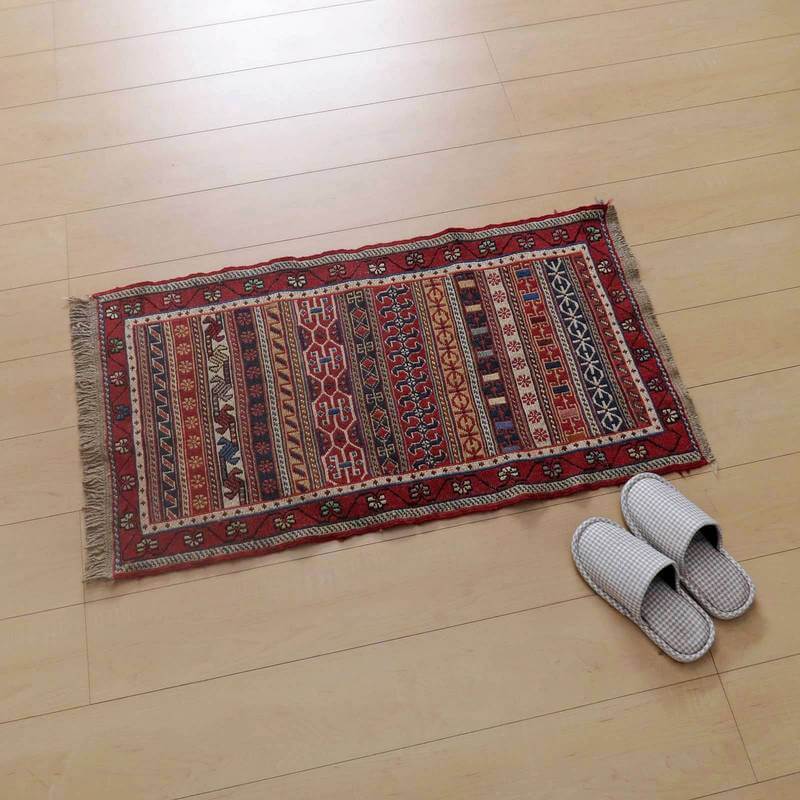 スマック織りとは、イランのキリムの織り方の技法です。生地は刺繍のような仕上がりですが、これは後から刺したものではなく、土台の縦糸と横糸の上にもう一本横糸を絡めるように巻き込んで織っていく高度なテクニックで、生地を二重に織るため通常の平織りのキリムより倍の手間ひまが掛かる分高価になりますが、非常に堅固で丈夫、また普通より細かなデザインを描けるという長所がありますので、価格以上の価値を感じて頂けるキリムです。 ※手織りの特性として優劣はつけておりませんが、左右の長さや上下の長さに数センチの違いが感じられます。気になる方、心配な方は問い合せ下さい。