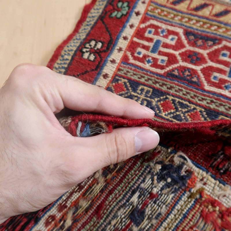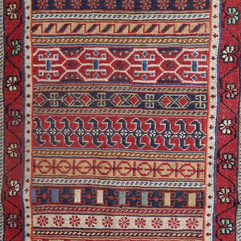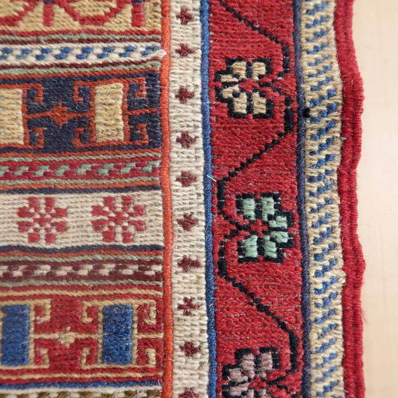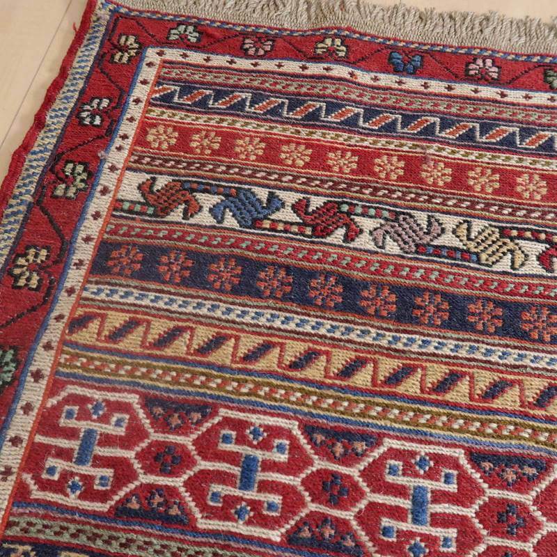 刺繍のように細かな文様が全面に施された美しいスマック織りのキリム。赤を基調に様々な色で文様が入った多色使いですが柄が細かいので落ち着きもあります。一目一目の模様をじっくり眺めて味わえるキリムでたいへん上質感があります。スマック織りは裏面に模様の糸を渡してあるので片面使いのキリムになります。
