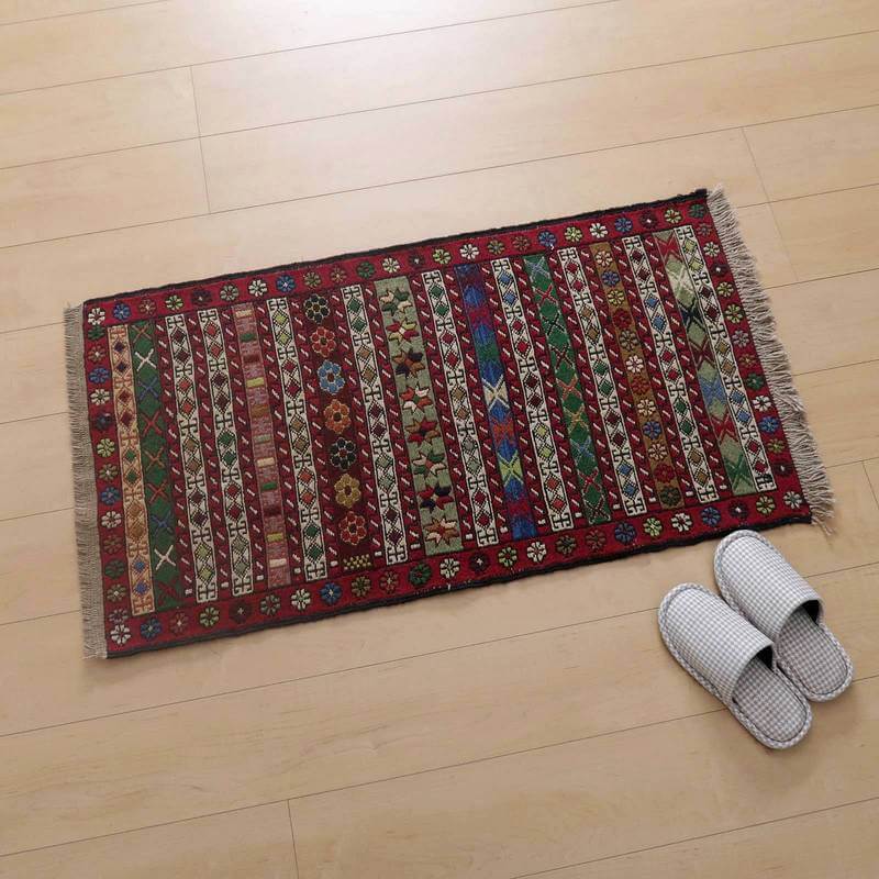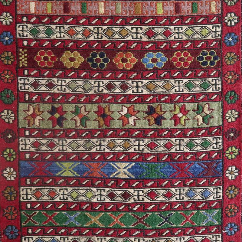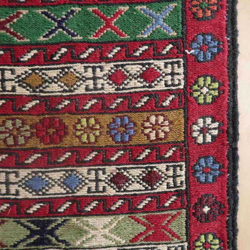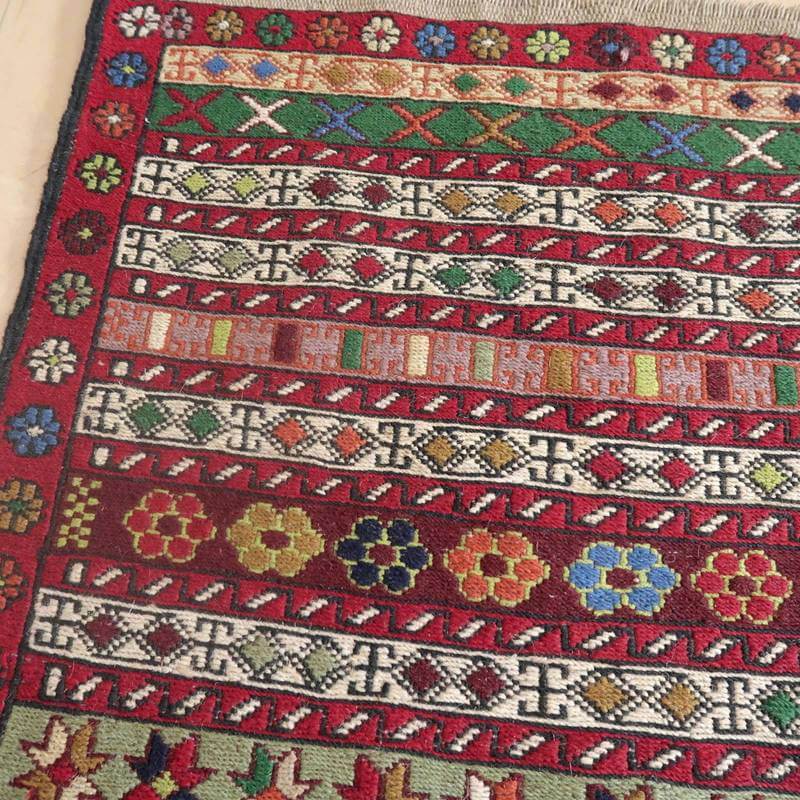 刺繍のように細かな文様が全面に施された美しいスマック織りのキリム。赤を基調に様々な色で文様が入った多色使いですが柄が細かいので落ち着きもあります。一目一目の模様をじっくり眺めて味わえるキリムでたいへん上質感があります。スマック織りは裏面に模様の糸を渡してあるので片面使いのキリムになります。
