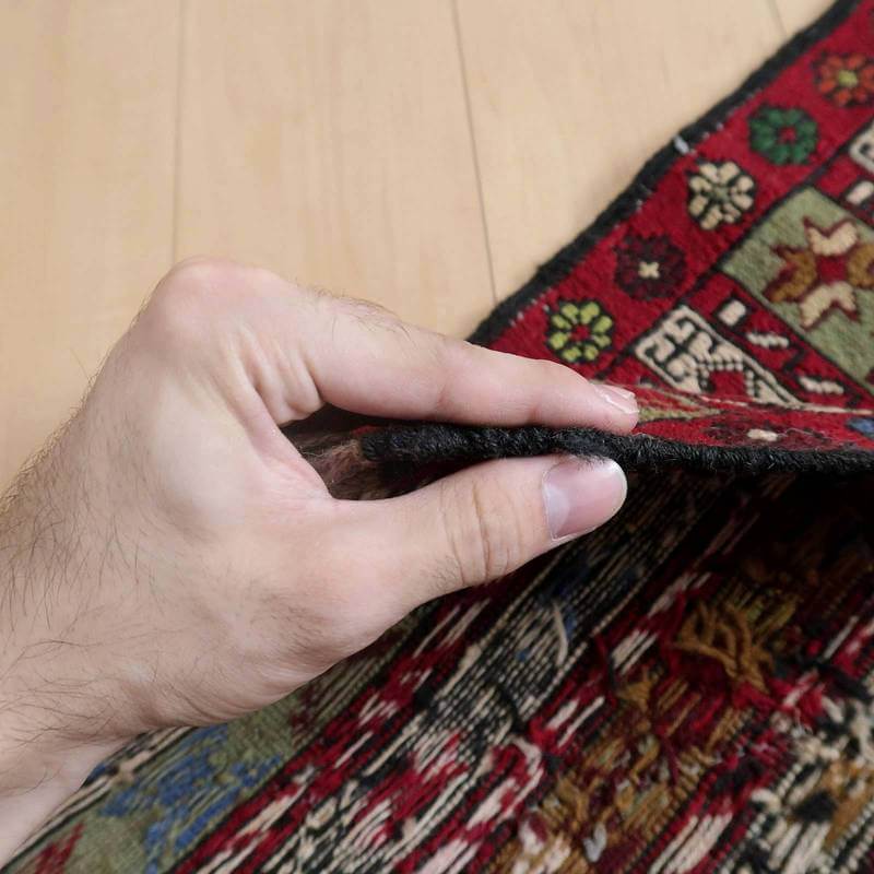 スマック織りとは、イランのキリムの織り方の技法です。生地は刺繍のような仕上がりですが、これは後から刺したものではなく、土台の縦糸と横糸の上にもう一本横糸を絡めるように巻き込んで織っていく高度なテクニックで、生地を二重に織るため通常の平織りのキリムより倍の手間ひまが掛かる分高価になりますが、非常に堅固で丈夫、また普通より細かなデザインを描けるという長所がありますので、価格以上の価値を感じて頂けるキリムです。