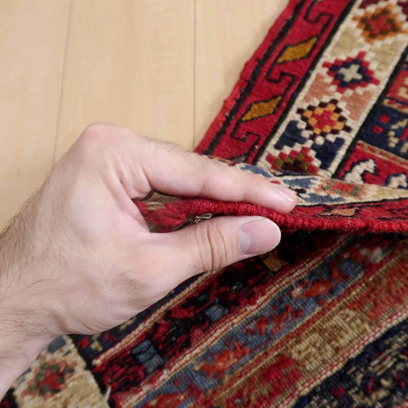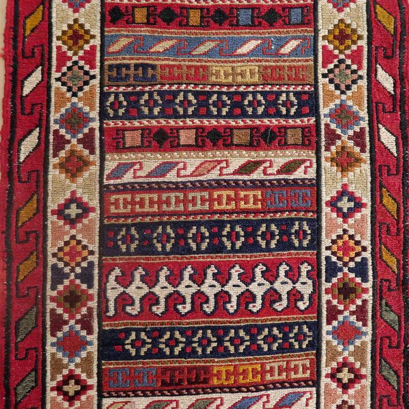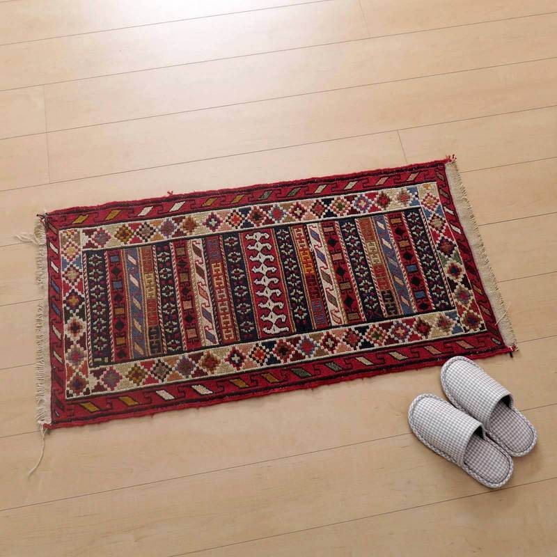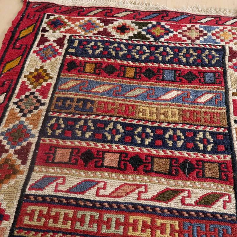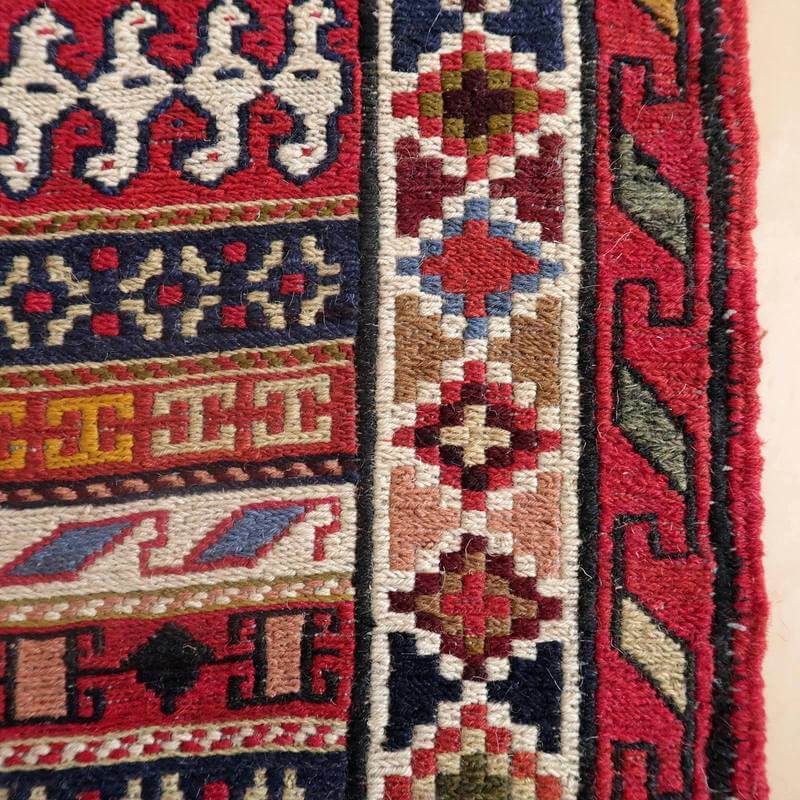 刺繍のように細かな文様が全面に施された美しいスマック織りのキリム。赤を基調に様々な色で文様が入った多色使いですが柄が細かいので落ち着きもあります。一目一目の模様をじっくり眺めて味わえるキリムでたいへん上質感があります。スマック織りは裏面に模様の糸を渡してあるので片面使いのキリムになります。