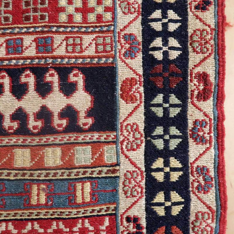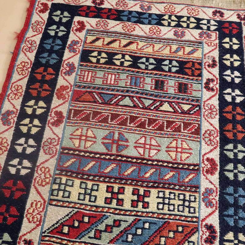 刺繍のように細かな文様が全面に施された美しいスマック織りのキリム。赤を基調に様々な色で文様が入った多色使いですが柄が細かいので落ち着きもあります。一目一目の模様をじっくり眺めて味わえるキリムでたいへん上質感があります。スマック織りは裏面に模様の糸を渡してあるので片面使いのキリムになります。