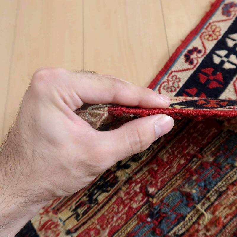 スマック織りとは、イランのキリムの織り方の技法です。生地は刺繍のような仕上がりですが、これは後から刺したものではなく、土台の縦糸と横糸の上にもう一本横糸を絡めるように巻き込んで織っていく高度なテクニックで、生地を二重に織るため通常の平織りのキリムより倍の手間ひまが掛かる分高価になりますが、非常に堅固で丈夫、また普通より細かなデザインを描けるという長所がありますので、価格以上の価値を感じて頂けるキリムです。