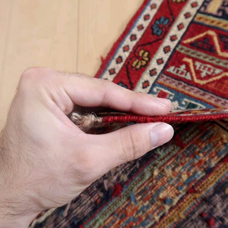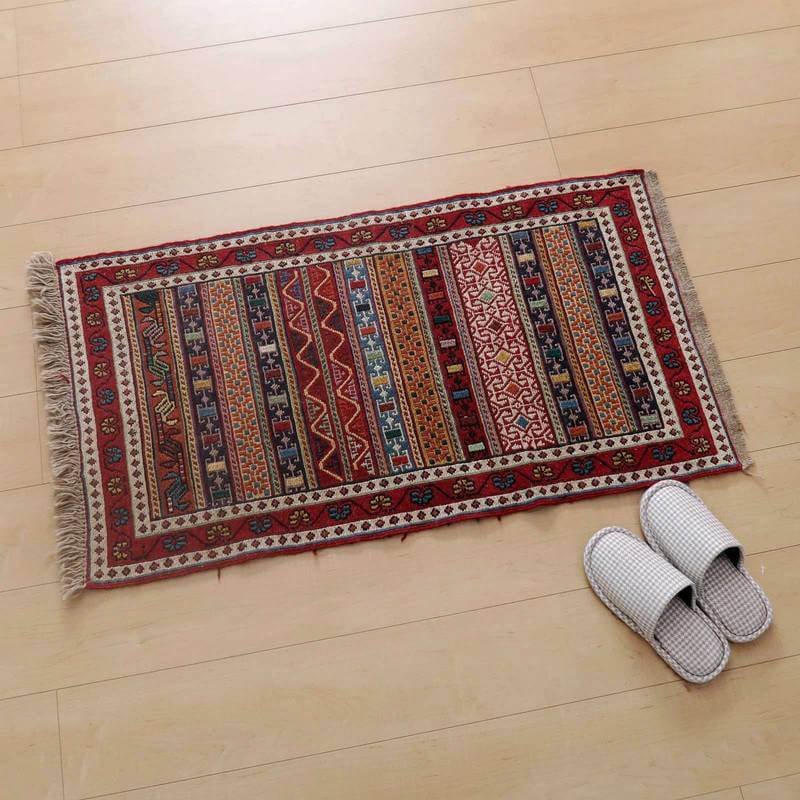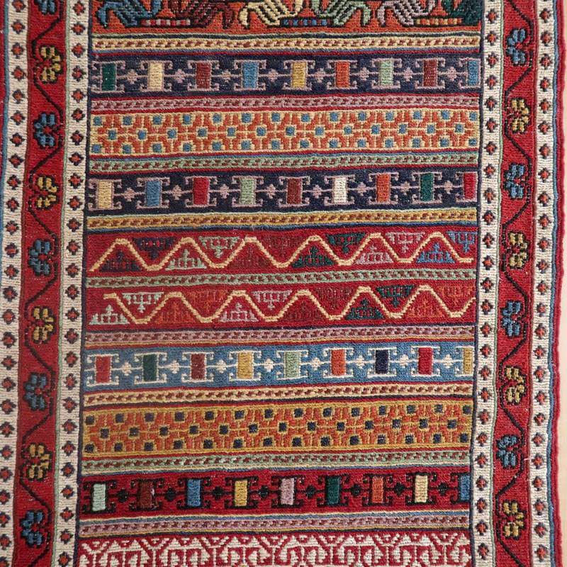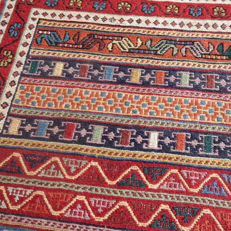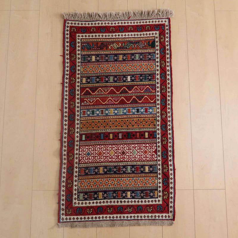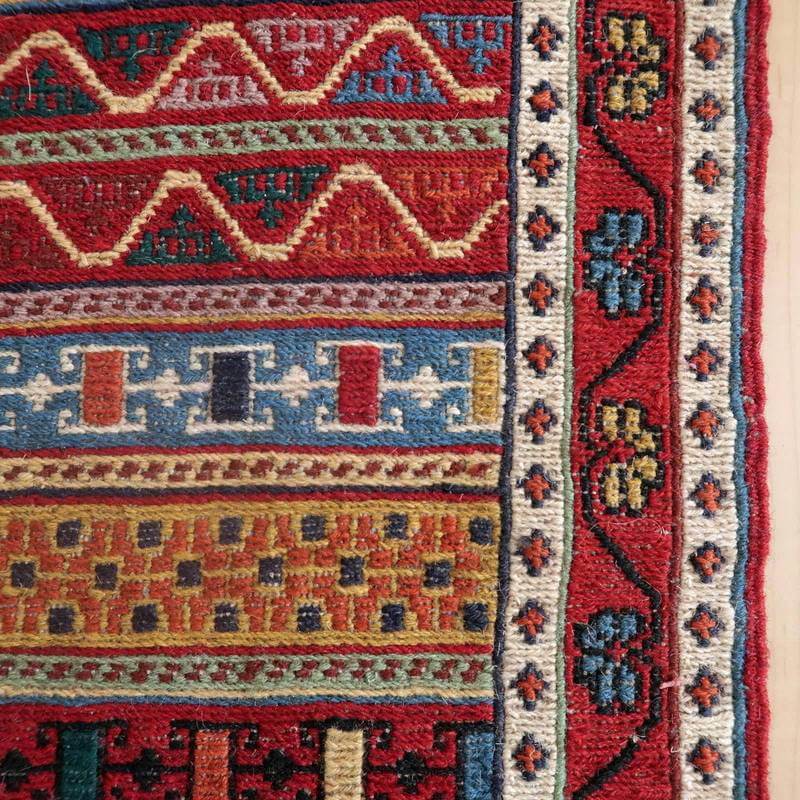 刺繍のように細かな文様が全面に施された美しいスマック織りのキリム。赤を基調に様々な色で文様が入った多色使いですが柄が細かいので落ち着きもあります。一目一目の模様をじっくり眺めて味わえるキリムでたいへん上質感があります。スマック織りは裏面に模様の糸を渡してあるので片面使いのキリムになります。