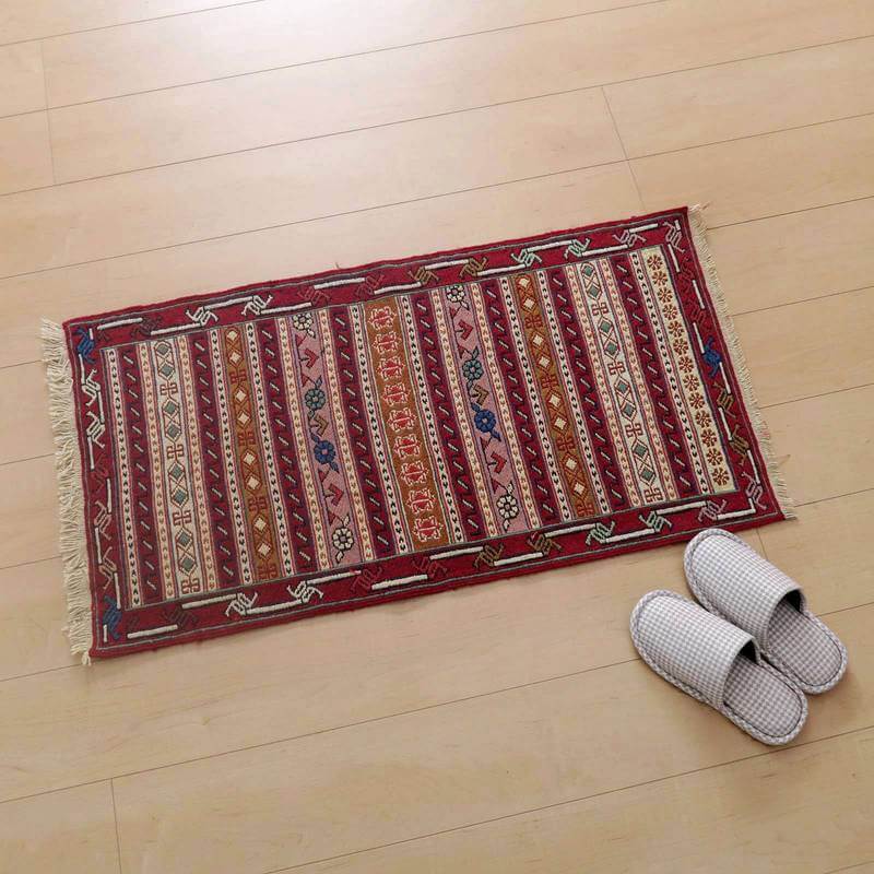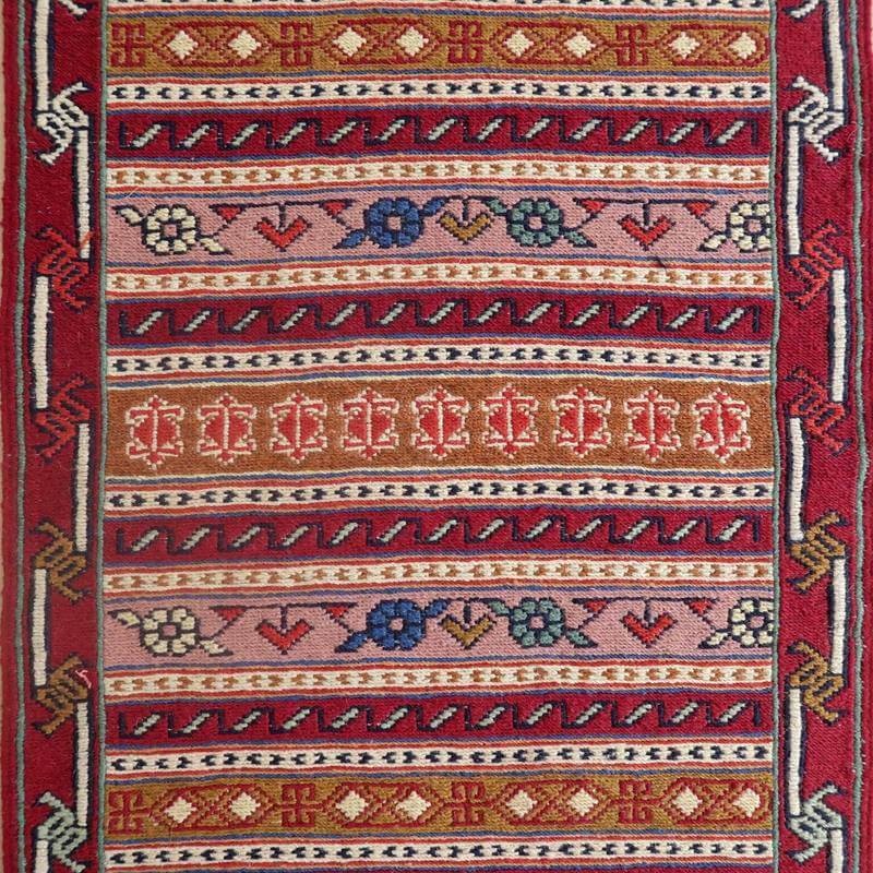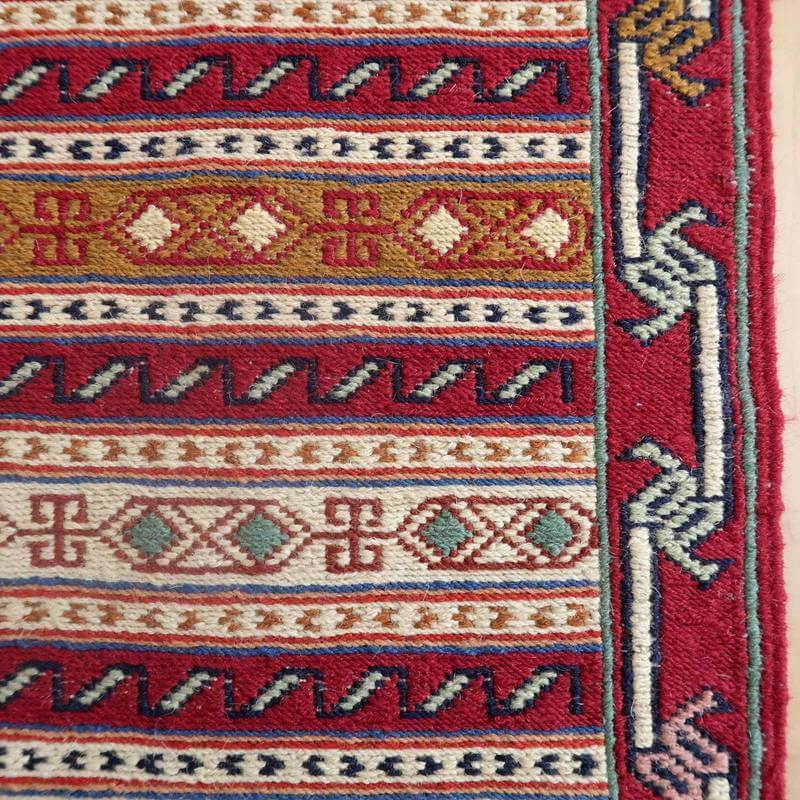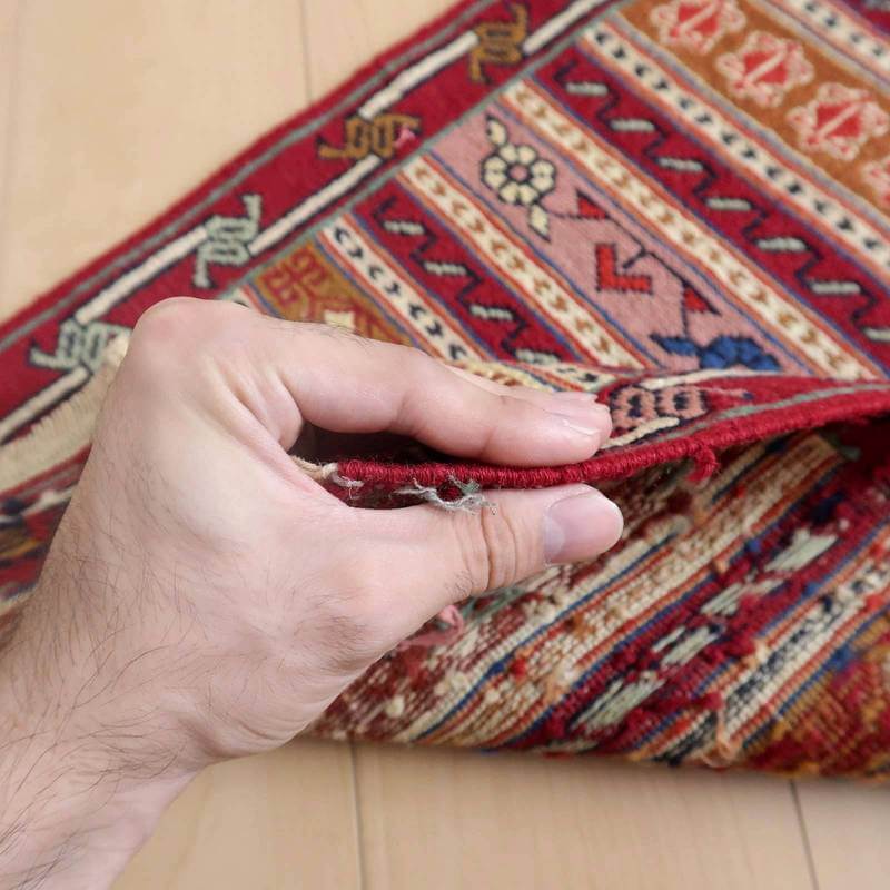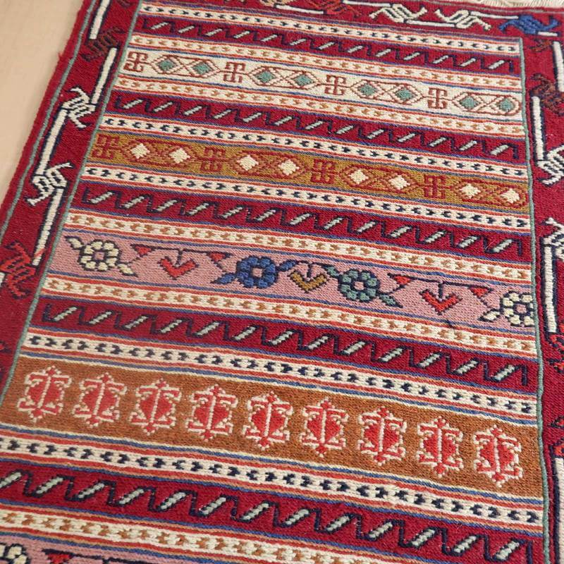 刺繍のように細かな文様が全面に施された美しいスマック織りのキリム。赤を基調に様々な色で文様が入った多色使いですが柄が細かいので落ち着きもあります。一目一目の模様をじっくり眺めて味わえるキリムでたいへん上質感があります。スマック織りは裏面に模様の糸を渡してあるので片面使いのキリムになります。